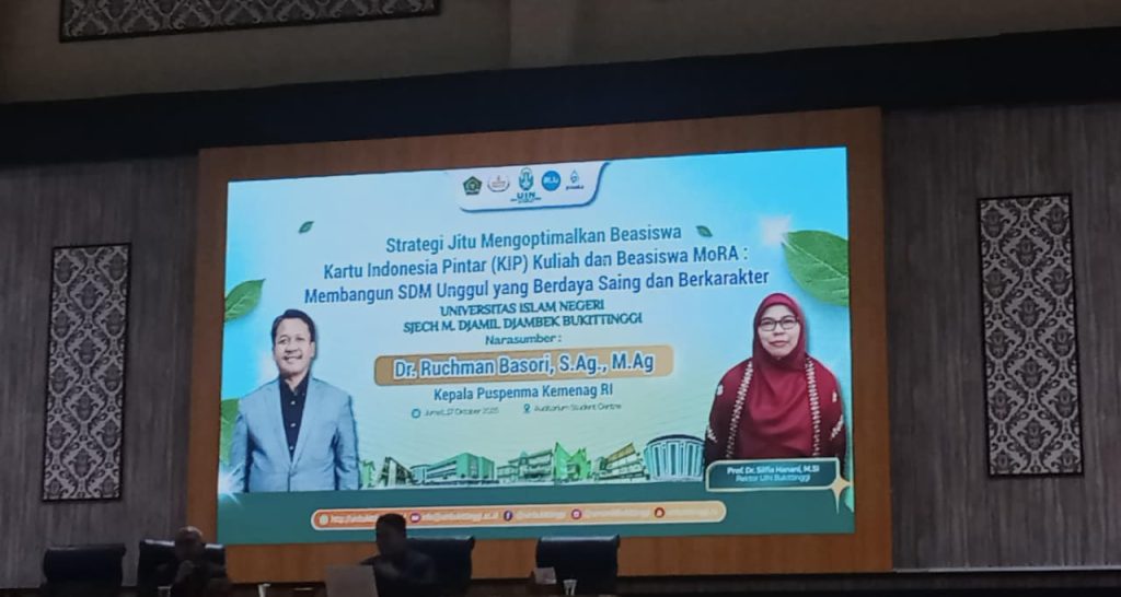 Dalam rangka meningkatkan kualitas mahasiswa, UIN Sjech M. Djamil Djambek Bukittinggi bersama Kepala Pusat Pembiayaan Pendidikan dan Pendidikan Keagamaan (PUSPENMA) Sekretariat Jendral Kementrian Agama RI melaksanakan kegiatan Studium General dengan tema “Membangun SDM Unggul Yang Berdaya Saing dan Berkarakter”. Kegiatan ini dilaksanakan di Auditorium Student Center UIN Bukittinggi, Jum’at 17 oktober 2025.