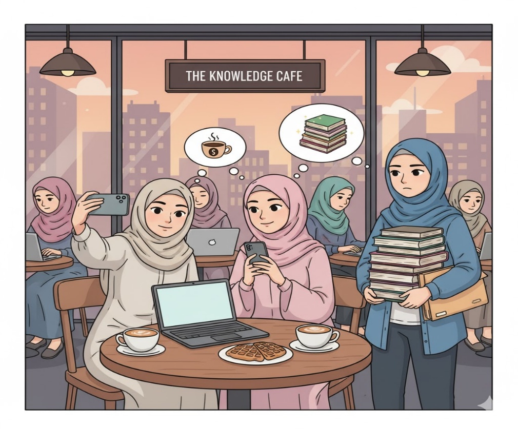 LPM Al-Itqan – Amira merapikan kerudung segi empatnya. Ia mematut diri di cermin kafe aesthetic langganannya, memastikan lighting di sudut itu sempurna untuk selfie nanti. Di meja, laptopnya terbuka, menampilkan lembar kerja kosong, berfungsi lebih sebagai properti daripada alat bantu belajar.